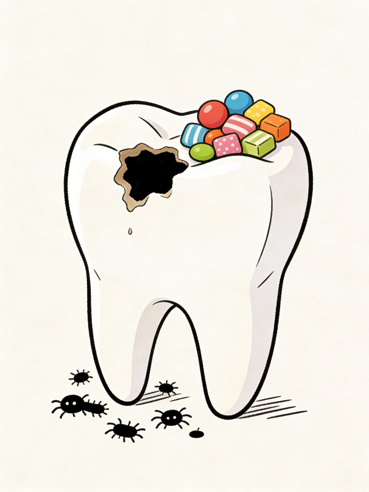 口腔里的细菌会把糖当成“口粮”,代谢后产生酸性物质腐蚀牙齿表面的牙釉质。牙釉质一旦被破坏就会形成蛀牙。