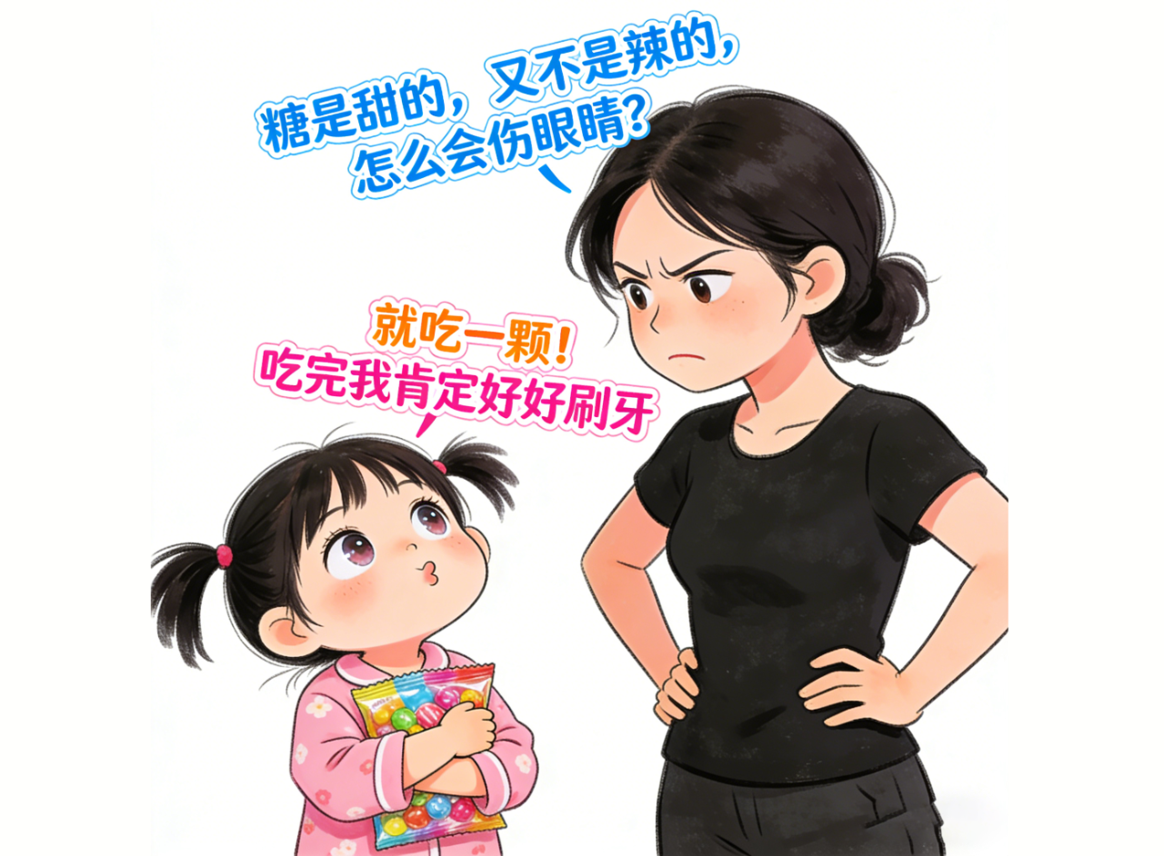 “就吃一颗!吃完我肯定好好刷牙”“糖是甜的,又不是辣的,怎么会伤眼睛?”