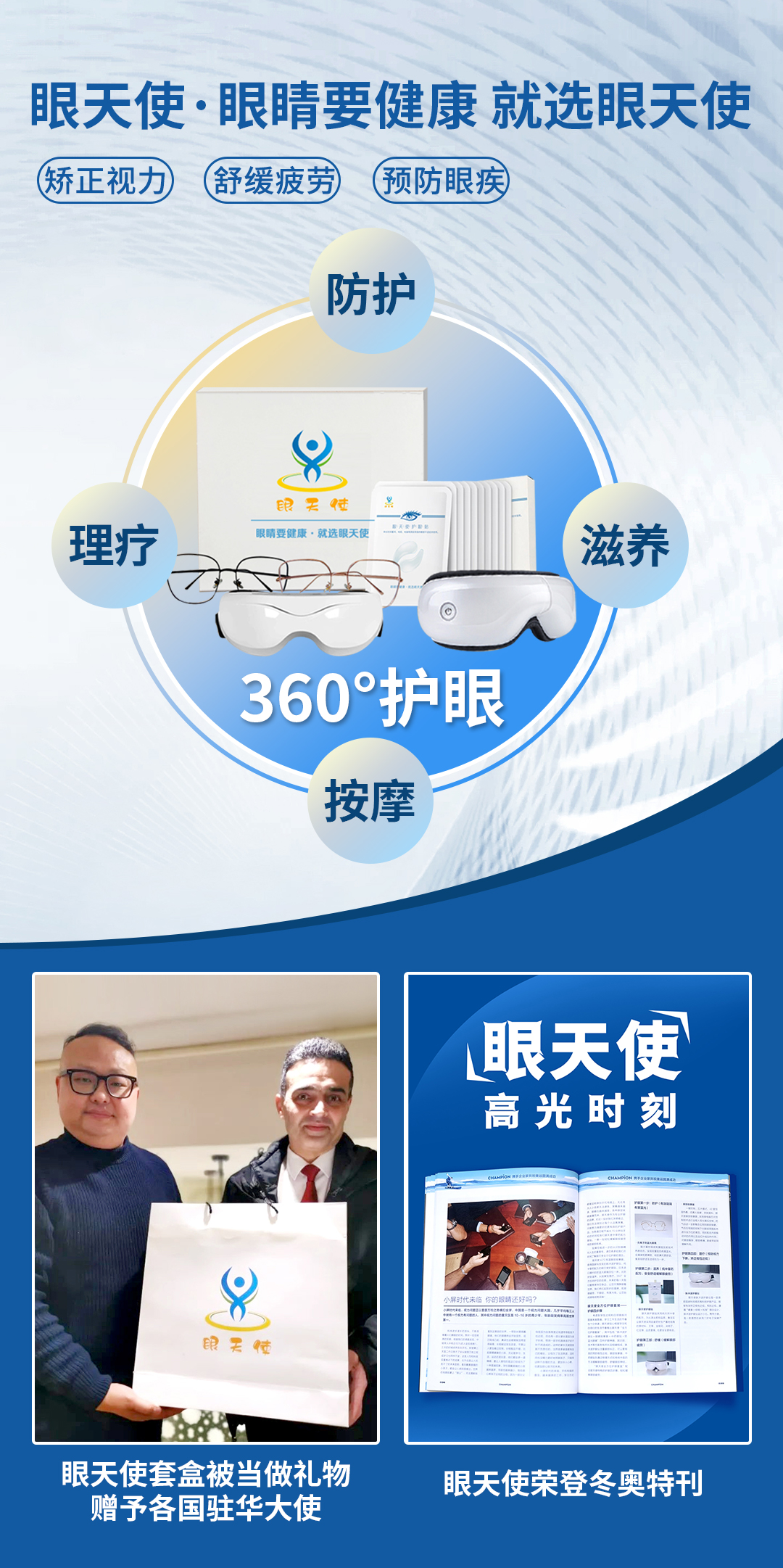 眼天使套盒包含四款产品:防蓝光眼镜、眼天使护眼贴、眼部按摩器、脉冲波护眼仪。